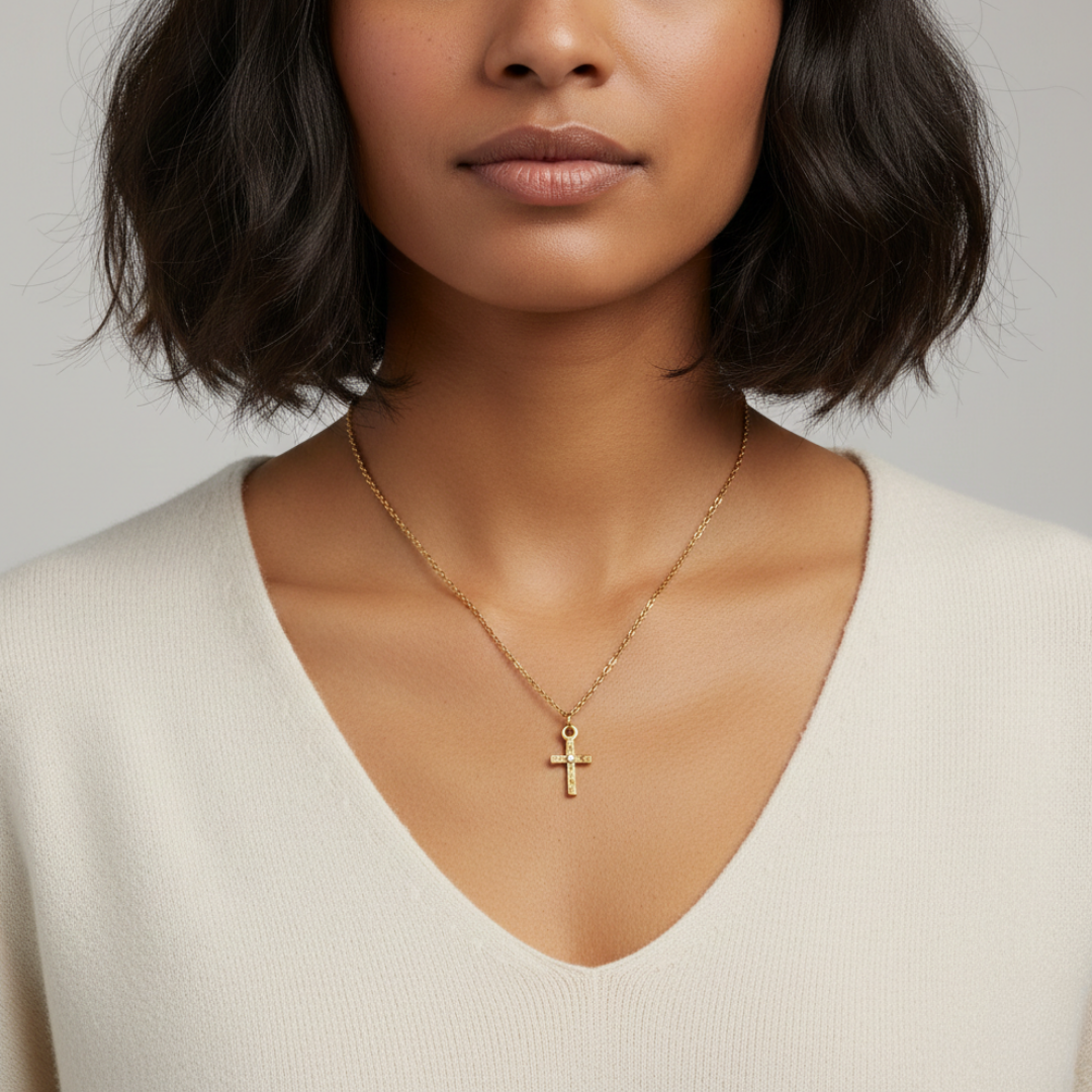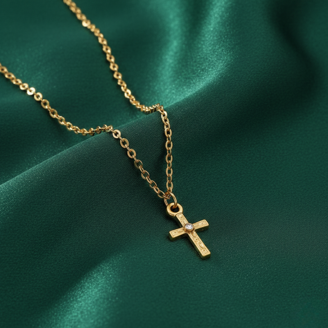 Round Crystal Gold Spiritual Cross Pendant Necklace 15" + 3" Extender
