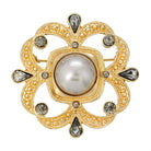 A gorgeous vintage-inspired piece. Featuring an ornate floral shaped brooch with a large domed faux pearl in a stormy grey with sparkling black diamond crystal accents all around. A fabulous accessory for a sophisticated woman.