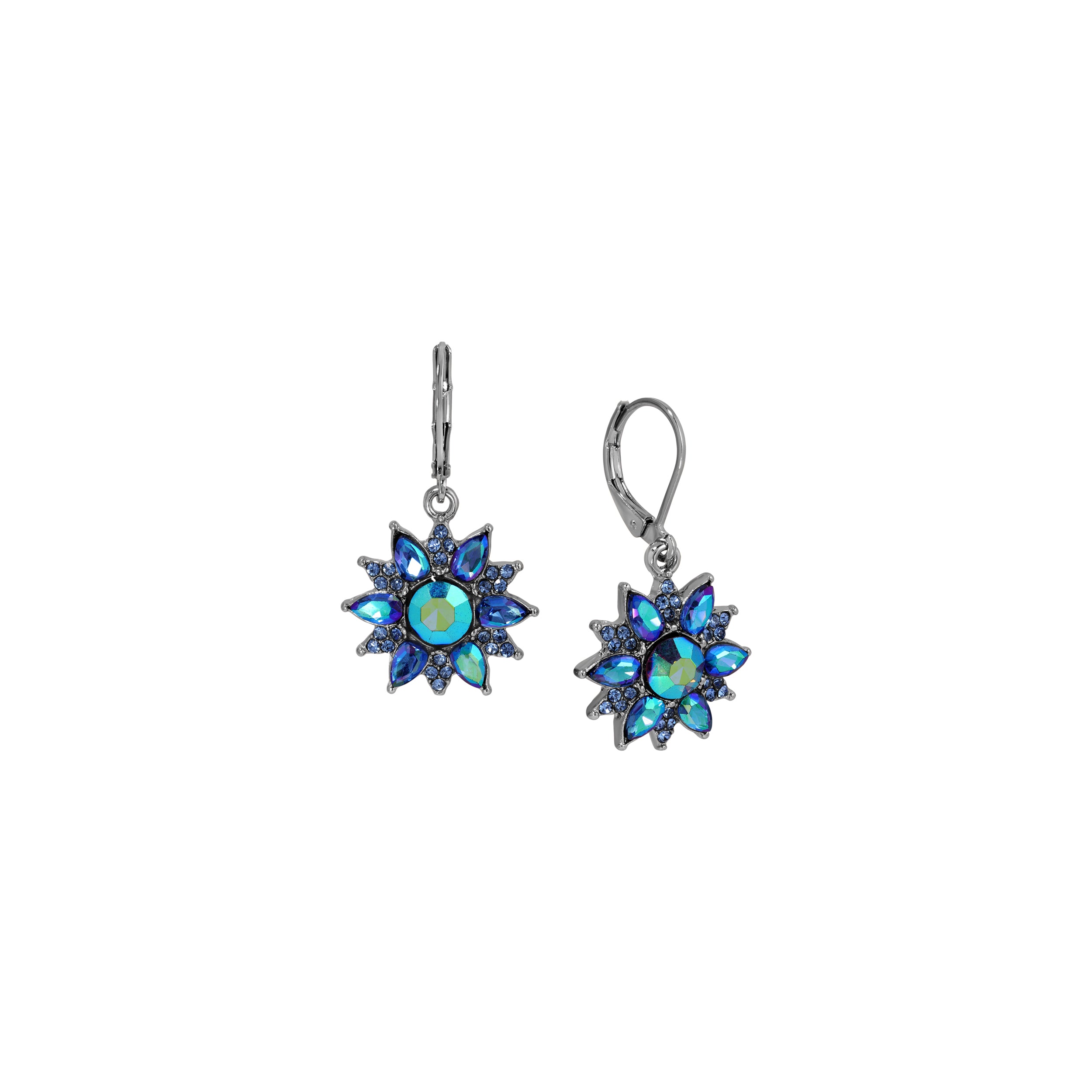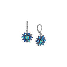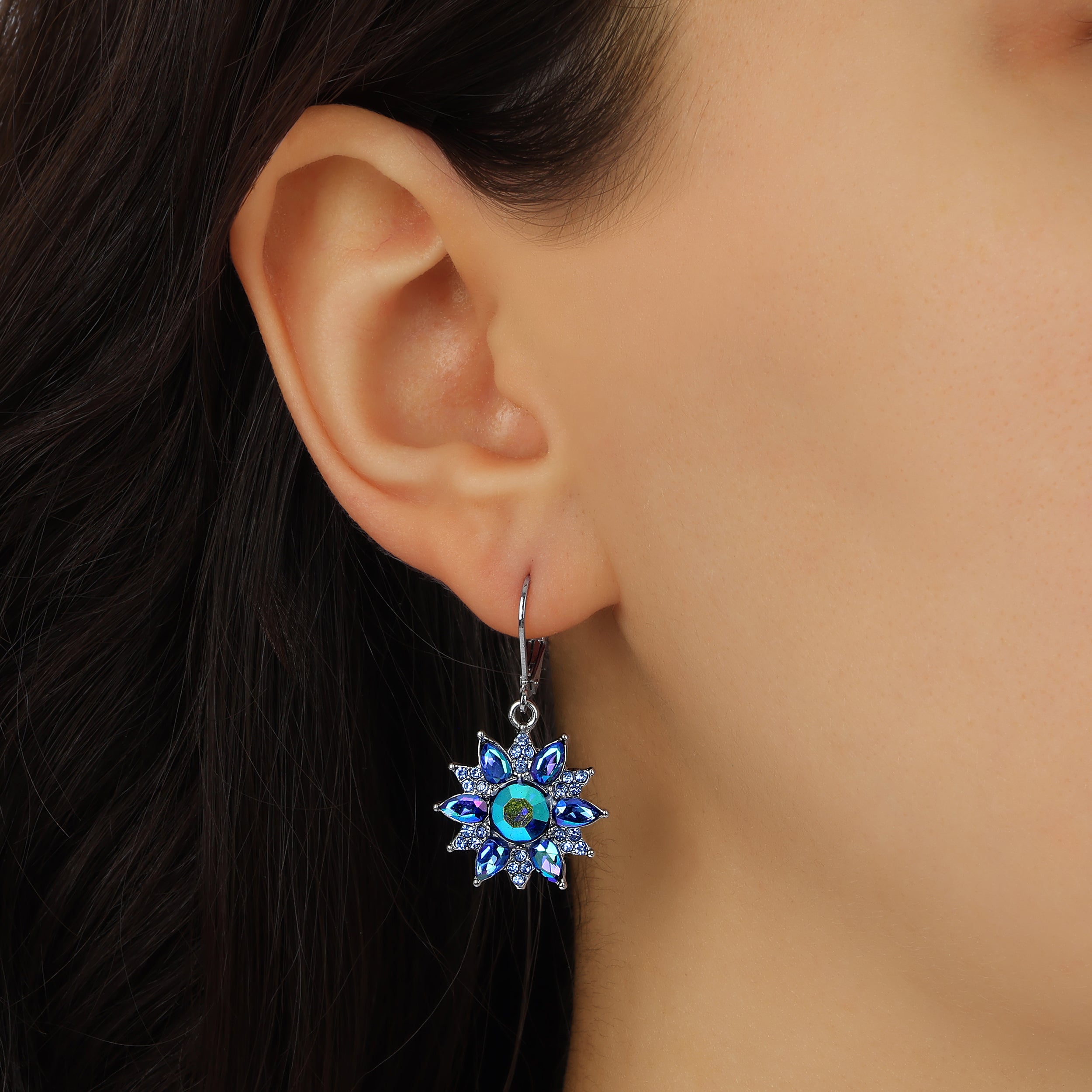 Radiant sunburst-inspired earrings shimmer with iridescent blue crystals that catch the light from every angle. Each petal-shaped stone surrounds a brilliant center crystal, creating a vibrant floral sparkle. The silver-tone lever back design adds a touch of elegance while ensuring comfortable, secure wear for any occasion.