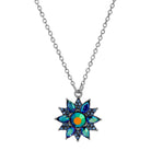 A shimmering sunburst pendant radiates with iridescent blue and light sapphire crystals that shift beautifully in the light. The intricate design features marquise-shaped stones surrounding a dazzling central gem, creating a captivating floral-inspired motif. Suspended from a delicate silver-tone chain, this necklace adds a touch of luminous charm to any look.