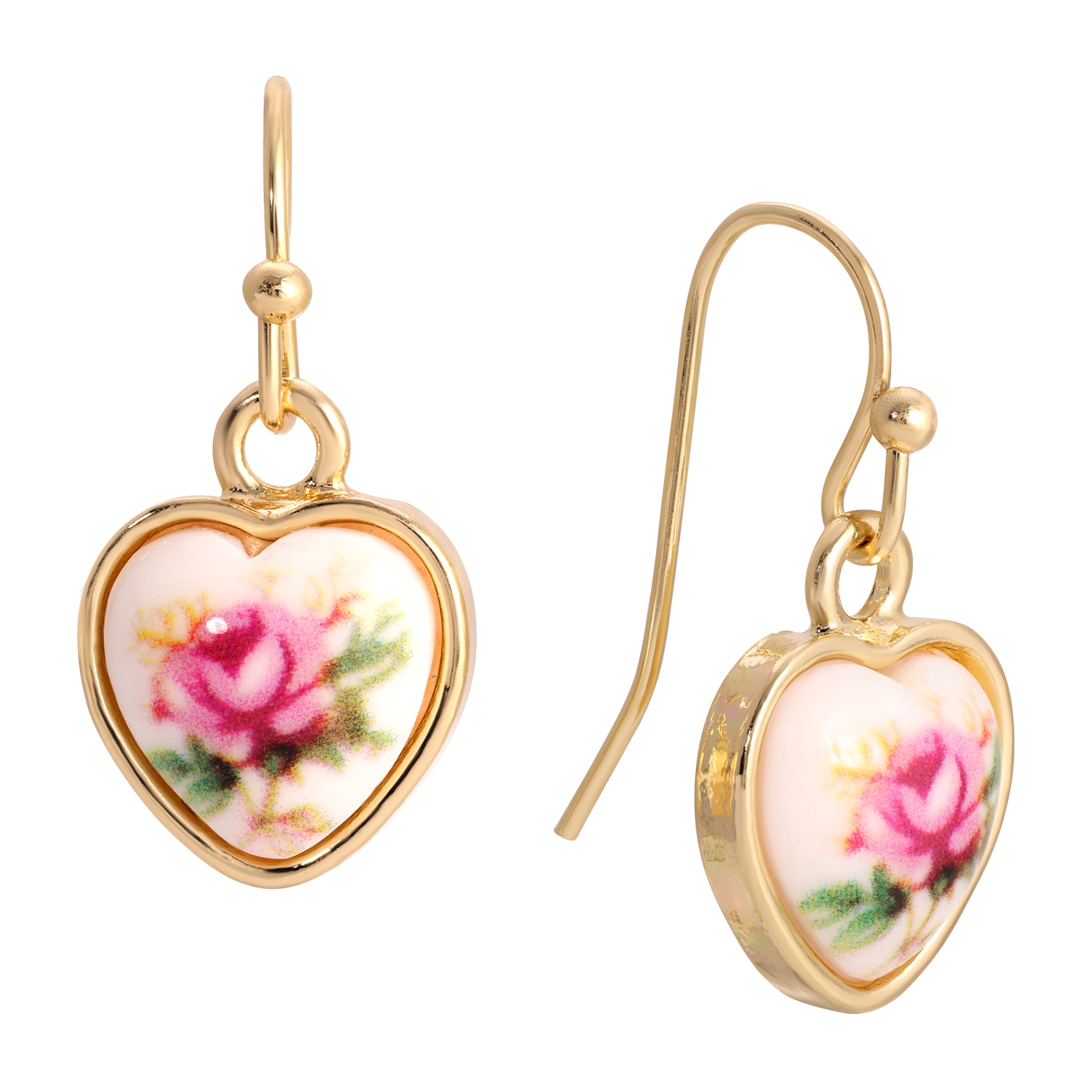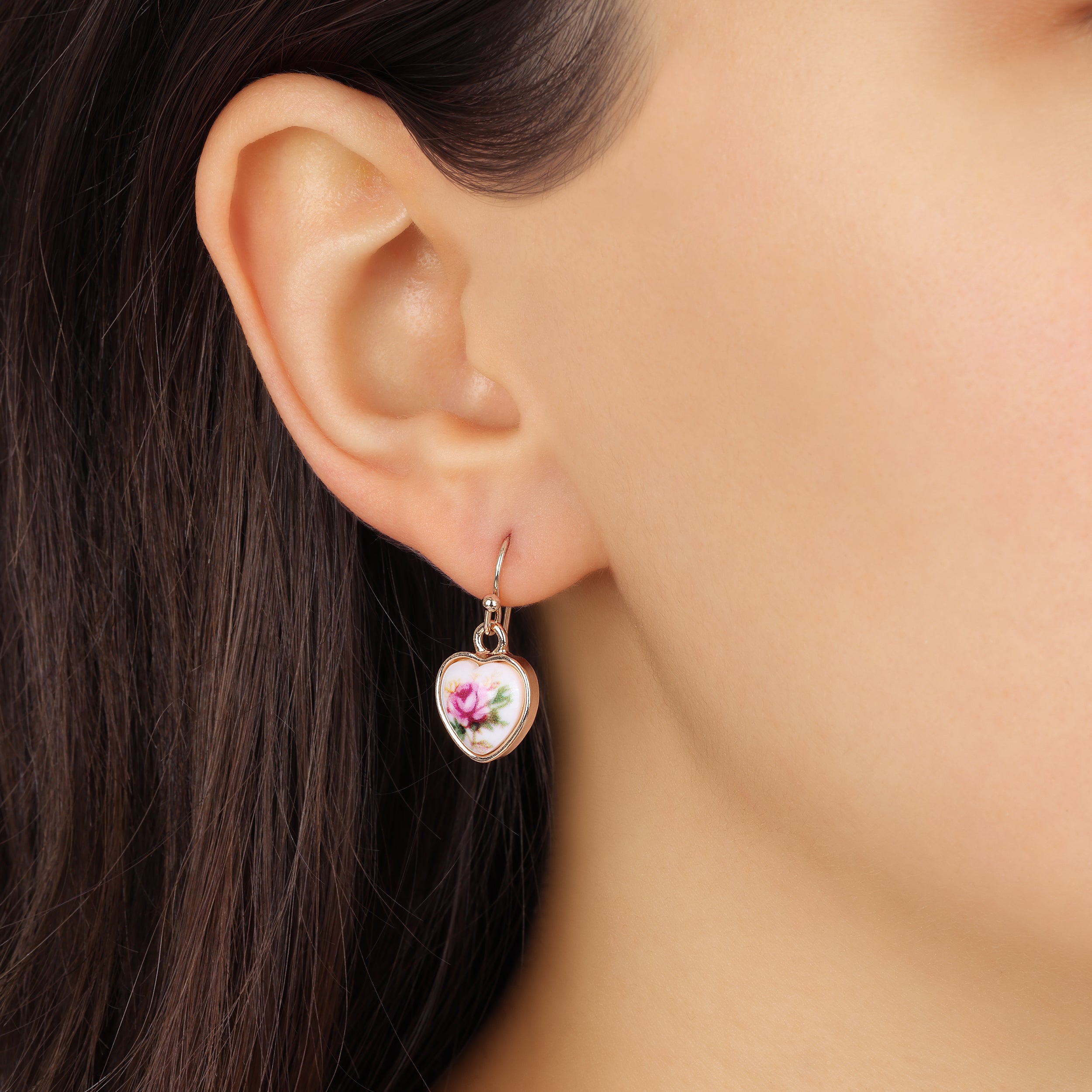 Charming heart-shaped earrings framed in gold-tone metal feature a vintage-style rose motif on a porcelain-like surface. The romantic floral design adds a touch of classic beauty to any look. Perfect for bringing a soft, feminine accent to both casual and dressy outfits.
