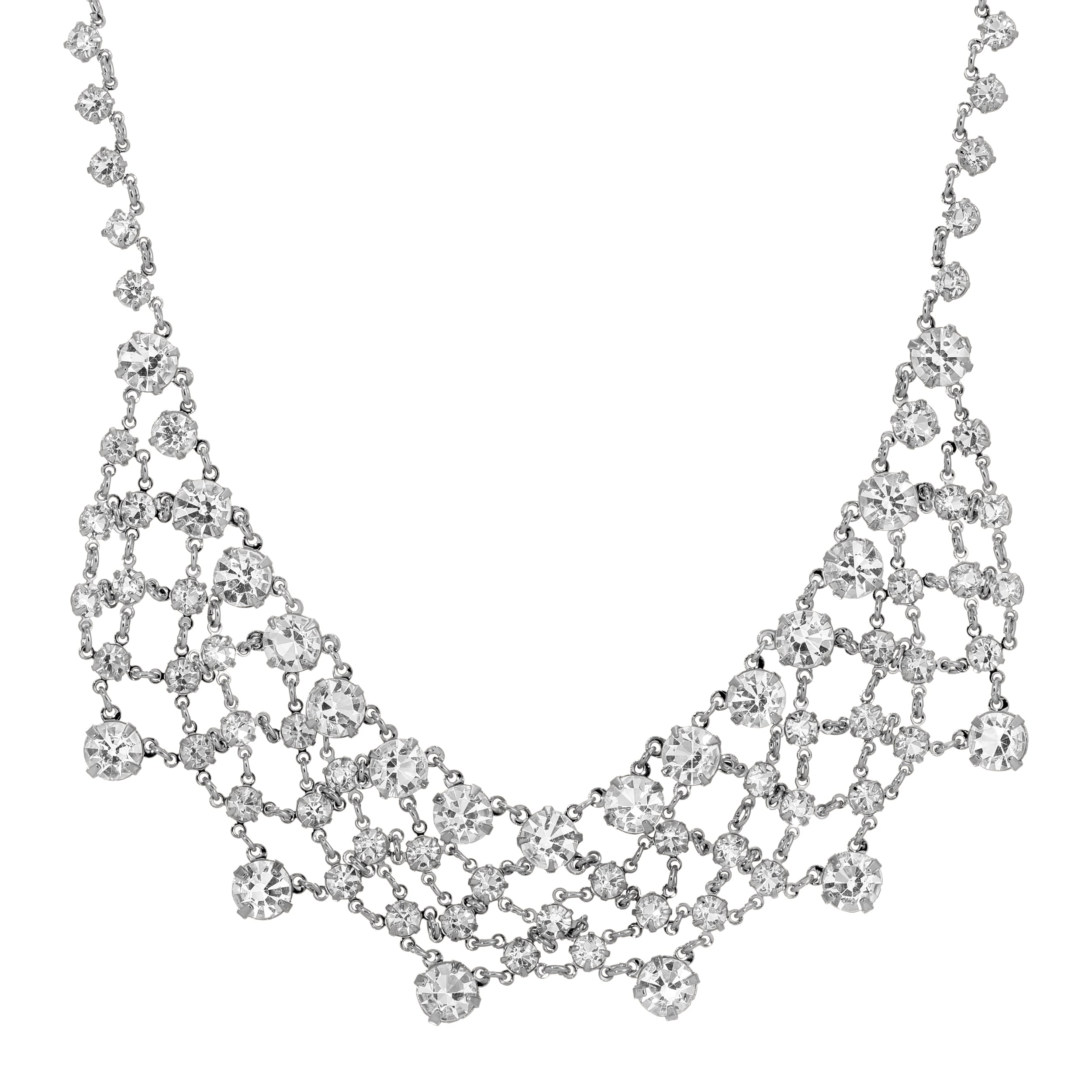 This necklace features an intricate lattice of shimmering crystals, creating a wide, draped design that sits beautifully along the neckline. Each stone is linked in a repeating pattern, adding layers of sparkle and a softly sculpted shape. The silver-tone finish ties the look together with a refined touch that highlights the brilliance of the crystal work.
