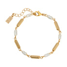 This bracelet pairs softly lustrous biwa faux pearls with ribbed cylindrical gold beads for a refined, modern rhythm. The alternating textures create visual interest while maintaining a light, wearable feel that transitions easily from day to evening. Finished with an adjustable chain and lobster clasp, it offers a comfortable fit with polished appeal.