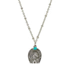 A beautiful and fashionable pewter horse shoe with horse head with turquoise bead dangles an adjustable small ball cable chain. This necklace comes with a 1928 logo tag and lobster clasps for simple closure,