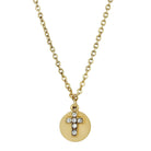 Simple & elegant is a perfect way to describe this charming little necklace. Featuring 14K gold dipped round disc with a beautiful crystal Czech stone cross. This necklace measures 16" in length with 3" available for adjustments with a petite lobster claw for a secure clasp.