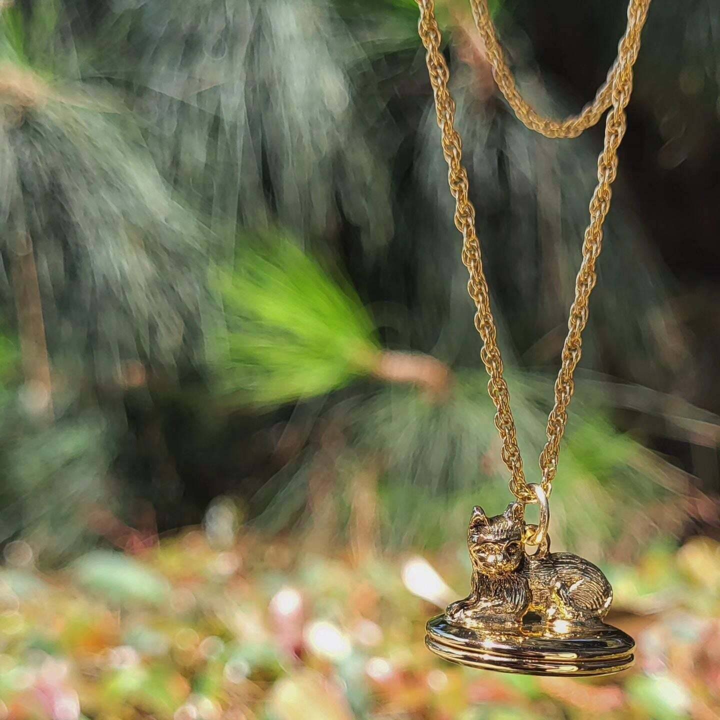This double photo locket necklace features a charming perched cat detailed with intricate artistry and dipped in radiant 14k gold. It hangs gracefully from a 28" rope chain, secured with a lobster clasp closure, offering both elegance and functionality. This piece is perfect for keeping cherished memories close while adding a unique touch to your jewelry collection.