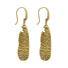 Hand crafted in California, these sculptured matte gold tone double sided linear drop earrings are accented with Austrian Crystals elements along the bottom.