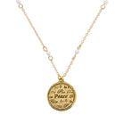 A beautiful a chic way to show you stand for peace! This multilingual peace pendant necklace features the word Peace in multiple languages on a pendant that has been dipped in 14k gold and dangles from a cable chain accented with white 3mm faux pearls. The necklace also comes with a 3inch extension chain and lobster clasp closure for a secure fit.