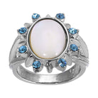A spring and summer favorite! The Aquamarine Crystal ring features an oval smooth genuine Mother Of Pearl accented with brilliant aqua marine crystals.
