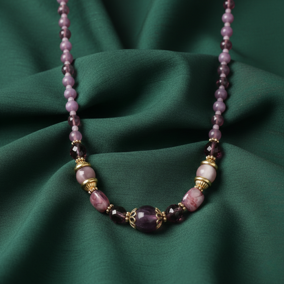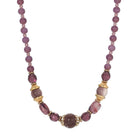 Elevate your style instantly with this majestic necklace. This necklace is meticulously crafted, with the accents elegantly dipped in luxurious 14K gold. The focal point of this stunning necklace is the captivating amethyst glass crystal beads, which shimmer with an entrancing depth and charm. Accentuating the design are round smooth amethyst moonlight beads, adding a touch of mystique to your ensemble.