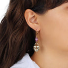 These striking earrings feature a unique heart skeleton padlock design, adorned with intricate vine details and accented by rich amethyst purple faceted beads. The dangling style offers an alluring charm, perfect for those who appreciate distinctive accessories. Finished with secure lever back closures, these earrings effortlessly combine elegance with a touch of mystery.