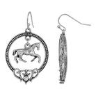 Unique in design and a favorite amongst horse enthusiasts, these set of earrings are made to impress. Featuring a round detailed antiqued pewter frame with a heart and clear crystal, plus a majestic dangling galloping horse. Made with fish hook backing.