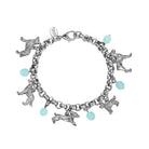 This charming round steel link bracelet boasts aqua blue baroque glass beads nestled between adorable dog charms, showcasing breeds like Husky, Labrador, Dachshund, Yorkshire, and Boxer. Each link tells a story, combining elegance with whimsy as it wraps around the wrist. Secured with a lobster clasp, it's a delightful addition to any jewelry collection for those who cherish their furry companions.