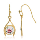 These pair of earrings work great for any attire! This set of earrings feature a wishbone with a round red flower decal at the center. The 14k gold dipped earrings dangle elegantly from fish hooks.