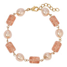 This bracelet features a striking blend of glass shatter peach beads and round baroque champagne faux pearls, offering a delightful contrast of textures and tones. Carefully chosen and strung, each bead contributes to the bracelet's refined and elegant appeal.
