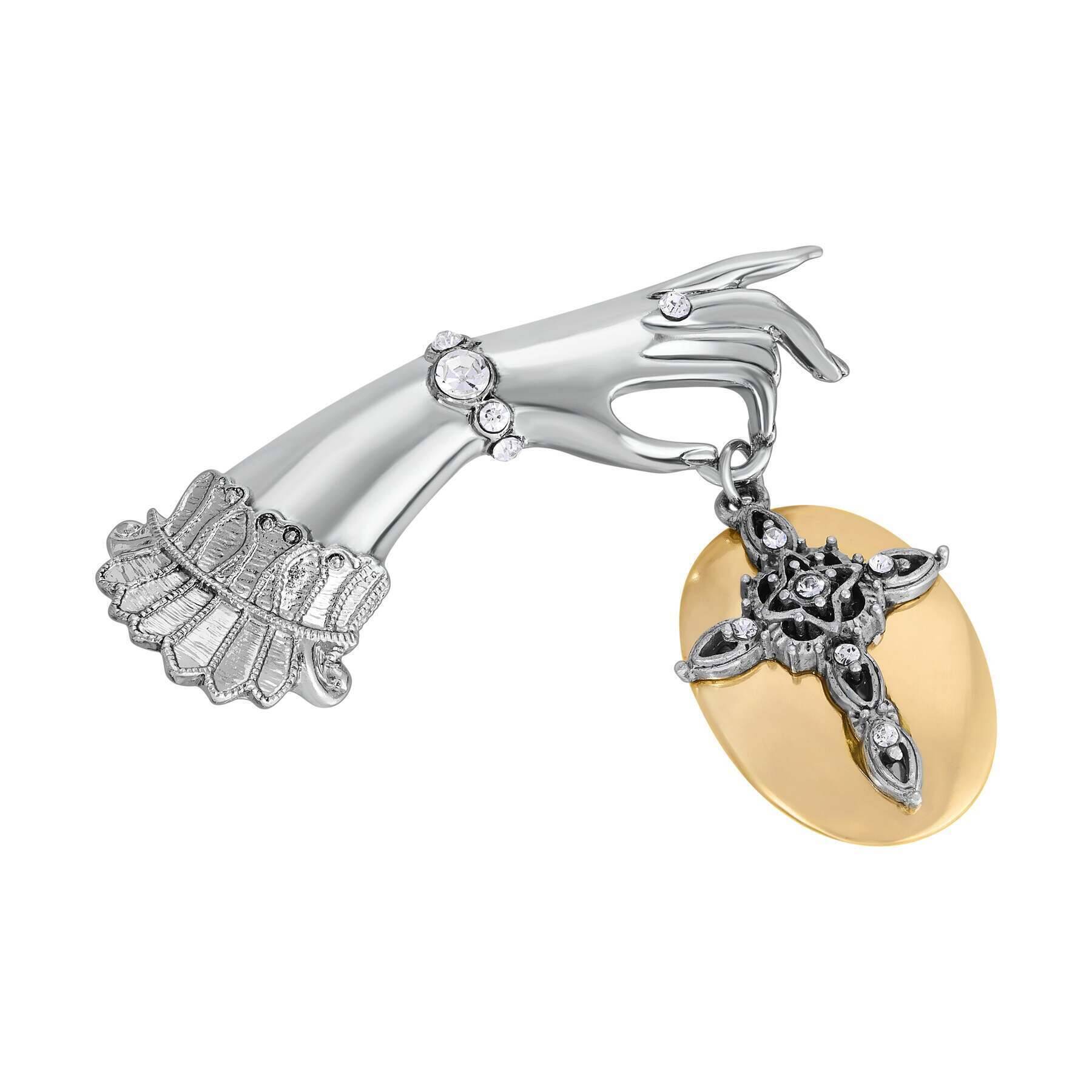 Add a true vintage feel to your scarf, jacket or label with this pin! Featuring a polished silvered colored hand with crystals that is holding a gold colored oval disk with cross, accented with crystals.