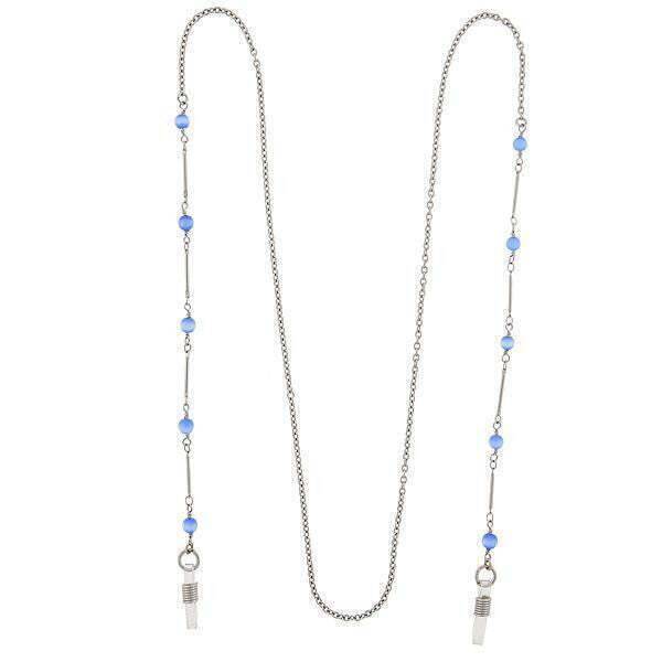 Featuring a silver tone chain decorated sapphire color cats eye beads. A fabulous way to keep your glasses conveniently close at all times.