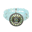 This stunning bracelet features two rows of aqua blue glass beads accented with silver-tone floral spacers for an elegant, vintage-inspired look. A hand-enameled round blue flower with delicate green accents serves as the centerpiece, adding a touch of charm and artistry. The stretchable design ensures a comfortable and effortless fit for any wrist.