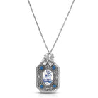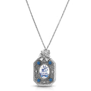 This multi-fictional necklace will make a perfect additional to your Blue Willow collection and also makes a great gift! Featuring an antiqued octagon pendant with round blue stones and bow, which opens to revel an oval mirror! The pendant dangles from a rope chain with lobster clasp closure.