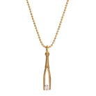 This distinctive necklace showcases a jeweler's tweezer dipped in 14k gold, delicately holding a petite, brilliant round European crystal. The pendant hangs elegantly from a 16-inch ball chain, fastened with a lobster clasp. It's a refined piece that blends sophistication with a hint of playfulness.