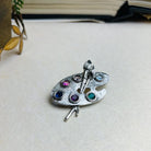 Presenting the "Da Vinci's Brush & Paint Palette Brooch," a sophisticated tribute to the artistic genius, Leonardo da Vinci. This meticulously crafted brooch embodies the spirit of creativity and artistry with its unique design. Crafted in the form of a painter's palette, this brooch features two delicately designed brushes nestled in the thumb hole, reminiscent of Da Vinci's own tools of the trade. The palette, instead of traditional paint colors, showcases a striking array of round channel crystals. Amethyst Purple, Light Rose Pink, Light Amethyst Purple, Light Sapphire Blue, and Sapphire Blue crystals glisten like a harmonious color palette, paying homage to the artist's mastery of color and light.