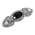 Channeling Art Deco elegance, this hair barrette is a testament to refined style. Encrusted with faux hematite stones, it radiates sophistication, while a central oval jet black faceted glass stone captures the essence of Art Deco allure. Completing the look, two light pink faux pearls adorn the sides, infusing a touch of vintage glamour into this meticulously crafted accessory.