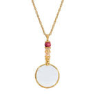 Discover this captivating antique-inspired necklace. Crafted in light peach enamel, it showcases a charmingly designed magnifying glass on a 30-inch knurled double rope chain, adorned with a round maroon howlite gemstone. Offering 1-2x magnification, it's perfect for reading restaurant menus, examining small objects, and is a joy to wear.