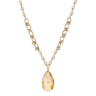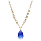 Enhance your look with this stunning necklace crafted from gold tone linking chains, adorned with round white faux pearls. The centerpiece of this piece is a magnificent faceted briolette glass crystal pendant, adding a touch of opulence to your ensemble.