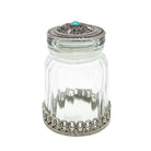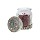 This beautiful ridged glass jar features an intricately designed base with floral patterns and delicate heart motifs at the top. At the lids center lies a stunning round turquoise matrix stone, surrounded by glistening Austrian padparadscha crystals and European baguette crystals that catch the light with every movement. A blend of elegance and charm, this jewelry is a radiant addition to any collection.