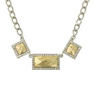 This dazzling silver tone necklace features three horizontal 14K Gold Dipped stones. This stunning two tone necklace will add glamorous style to your wardrobe!