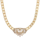This exquisite necklace exudes a vintage-inspired allure, exquisitely crafted to adorn sophisticated affairs such as galas, weddings, and other special occasions. Its allure lies in the impeccable design, boasting a meticulously fashioned brick link chain luxuriously dipped in 14K gold. The piece is further elevated by the resplendent brilliance of meticulously cut round and navette-shaped crystals, each shimmering with captivating elegance.