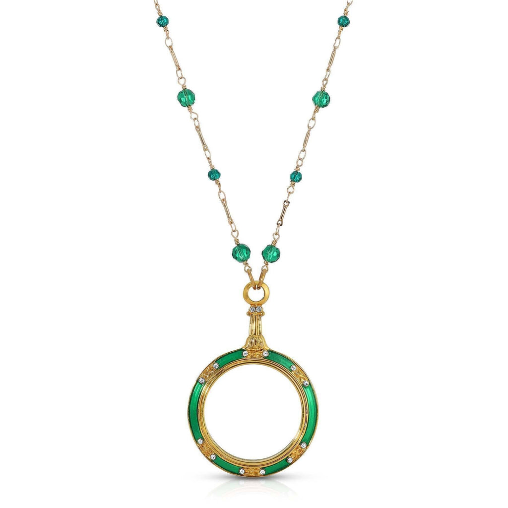 A lovely vintage inspired magnifying glass necklace ideal for reading any small print on the go! Featuring a 35mm round glass magnifier with magnification power 1-2x on a Art Deco style round pendant, enameled by hand and accented with tiny crystals. This pendant dangles from s station chain accented with faceted glass crystal beads.
