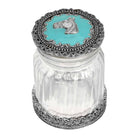 Whether keeping it classic by using this as a button jar or using to store loose change, this vintage inspiration is quality made from top to bottom. Featuring a detailed pewter base with flowers surrounding the jar and a lid mixed with ornately designed pewter & hand enameling in turquoise. At the center of the lid is a beautiful horse head made of pewter, The classic ridged glass jar opens and closes with ease.