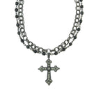 Featuring a black tone cross decorated with crystal accents. This ornate pendant cross necklace is held by a 16" adjustable intricate multi-link chain accented with black faceted crystal beads.