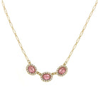 Delicate, yet playful. This charming necklace features a set of three oval lucite pink Czech Glass stones with an elegant halo of clear Czech crystals held by a charming gold toned chain with lobster clasp and 3" extender.