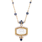 A show-stopping accessory for Renaissance and Baroque style lovers and fashionistas alike. A queenly pearl-lined, gold-toned setting frames the splendor of an iridescent faux pearl relief of a floral arrangement. Bedecked with interspersing blue jewels striking against the radiant gold chain.