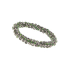 This beautiful multi green Slinky stretch bracelet is made with stacked and rounded hourglass like beads topped with a medley of muted blue and transparent green enameling with a silver body.