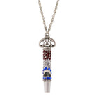 A vintage-inspired whistle pendant sparkles with red, clear, and blue crystals arranged in a striking tricolor pattern. The antique-style metalwork at the top adds an ornate touch that pairs beautifully with the textured chain. This playful yet elegant piece works as both a statement accessory and a charming nod to classic novelty jewelry.