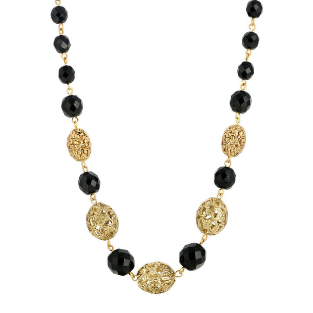 1928 Jewelry Oval Filigree & Black Beaded Necklace 16" + 3 " Extender