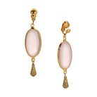 These 14k gold-plated clip-on earrings showcase a delicate design, featuring a translucent pink oval stone adorned with a drop of gold beads. Their lightweight designs ensures effortless wearability, making them an elegant addition to any ensemble.