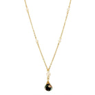 Delicate and feminine, this minimalist necklace features a lovely faceted black pink floral bead, which dangles gracefully from a 16" adjustable gone tone chain with white faux pearls.