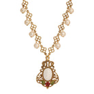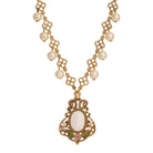 This necklace features a delicately patterned chain accented with dangling faux pearls that catch the light with every movement. At its center hangs an ornate filigree pendant, showcasing a raised ivory-tone cabochon faux pearl framed by a painted rose and green leaf detailing. The design draws from antique motifs, creating a romantic statement piece with classic charm.