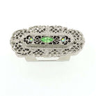 This elegant lipstick holder exudes vintage charm, showcasing an intricate filigree design that embodies timeless sophistication. At its center, a striking marquise-cut peridot green crystal takes prominence, flanked by two dazzling green aurora borealis crystals that add a subtle, iridescent sparkle. Crafted in a silver-tone framework with ornate details, this piece not only serves as a functional accessory but also as a stunning statement of classic style.