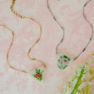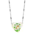 This necklace features a heart-shaped vintage porcelain pendant, originally from 1985, with a decal of blooming rose with green leaves. Suspended on a chain with cylindrical accents, it carries a nostalgic charm rooted in classic design. A lovely piece for adding a subtle floral detail with a touch of history.