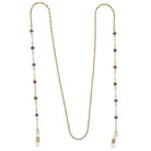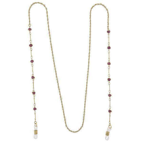 Featuring a gold-tone chain decorated amethyst color cat's eye beads. A fabulous way to keep your glasses conveniently close at all times.