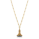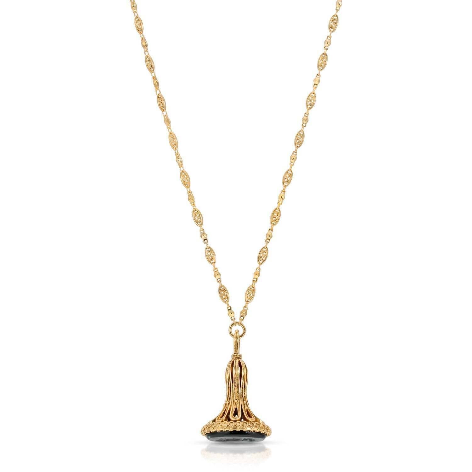 "Victory Chariot" necklace showcases a brilliant intagliostyle engraving of the triumphal procession of a Roman chariot on a jet-black German glass stone. Framed by a 14K gold dipped bell-shaped pendant on a scroll link chain finished with a lobster clasp and golden 1928¨ logo engraved jewelry tag.