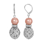 An elegant set of earrings featuring an oval filigree puff bead with a rondelle crystal bead & a 10mm round raspberry faux pearl on lever backs.