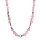This stunning strand necklace showcases round pink peppermint beads complemented by delicate gold accents and rose pink lantern crystals for a touch of elegance. The adjustable 3-inch extension chain ensures a comfortable fit, while the lobster clasp closure provides security.