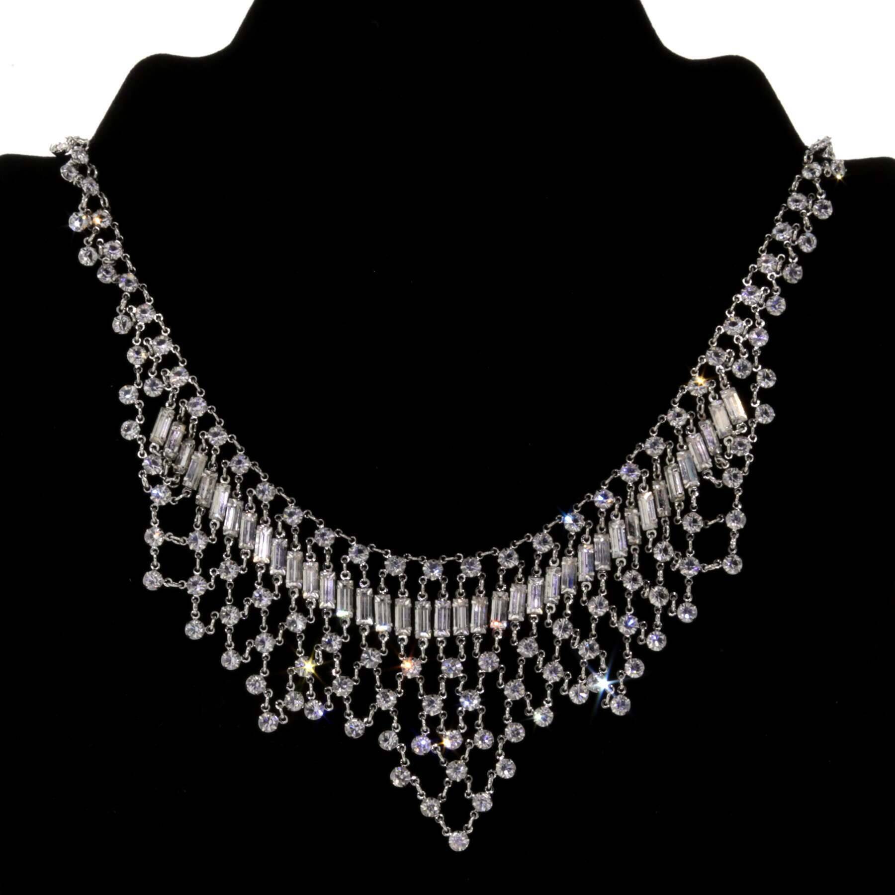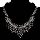 An exceptionally rare and gracefully elegant bib statement necklace, adorned with both round and Baguette Austrian Crystals, suspended from a silver-tone chain. This vintage masterpiece, unworn and unique, carries a remarkable history spanning over four decades.
