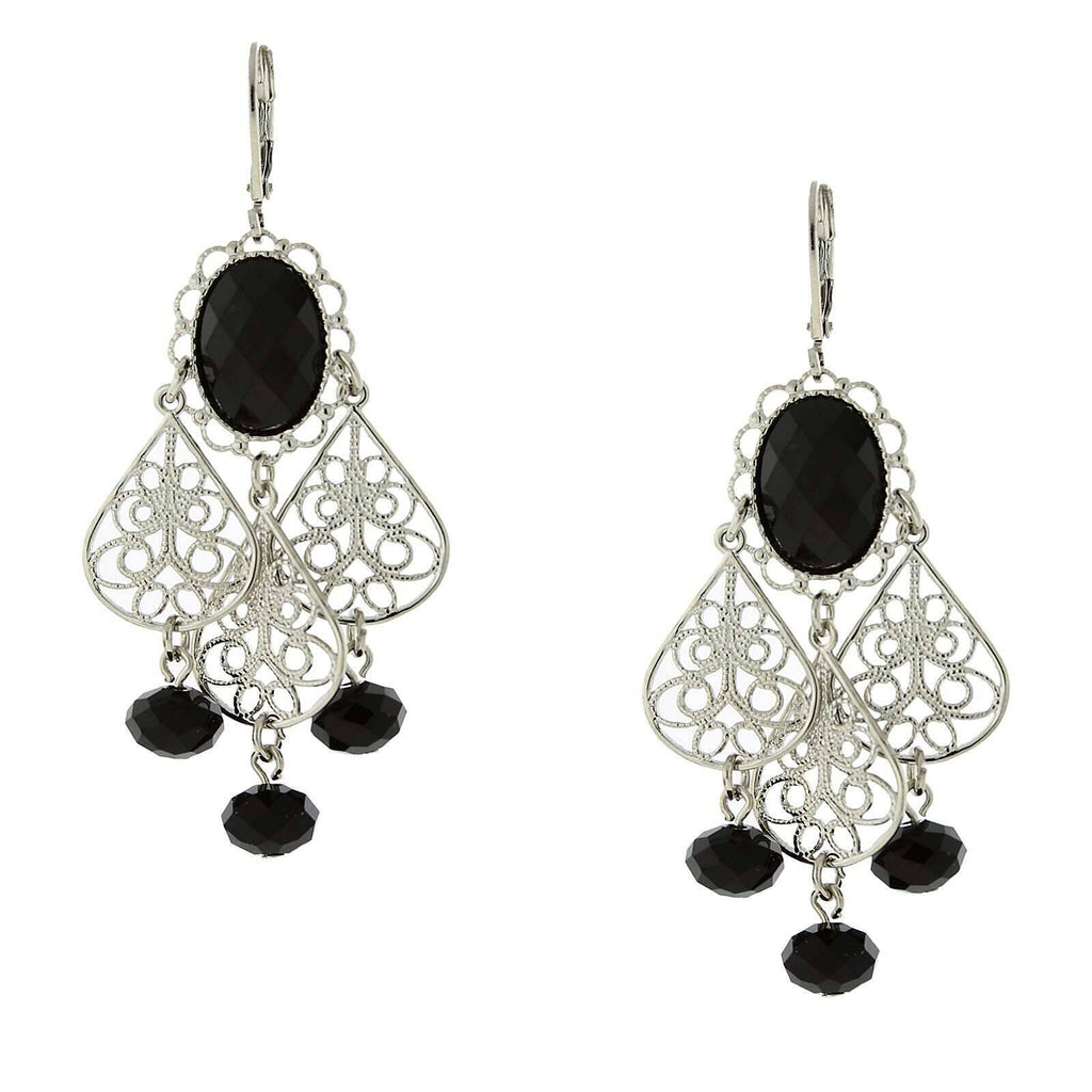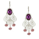 Beautiful chandelier earrings featuring three detailed silver-tone filigrees with a faceted stone at the center and crystal beads that hang below.
